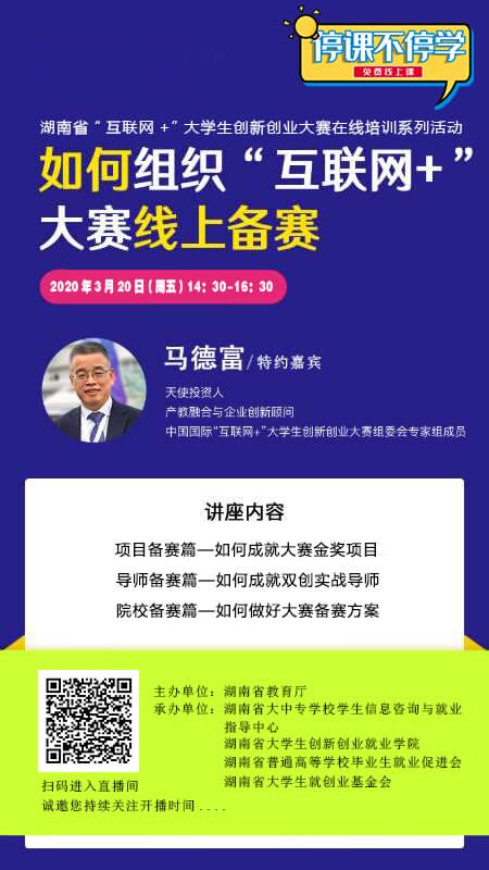 湖南省“互联网+”大学生创新创业大赛组委会将从本周开始进行创新创业大赛线上培训,大赛组委会秘书处将邀请全国知名专家以在线互动等形式,指导全省各高??勾葱麓匆到逃萄Ш脱盗肥导龊谩钡诹熘泄省チ?’创新创业大赛“全国选拔赛的备赛工作,请大家准时收看??纬淘じ妫?/p>