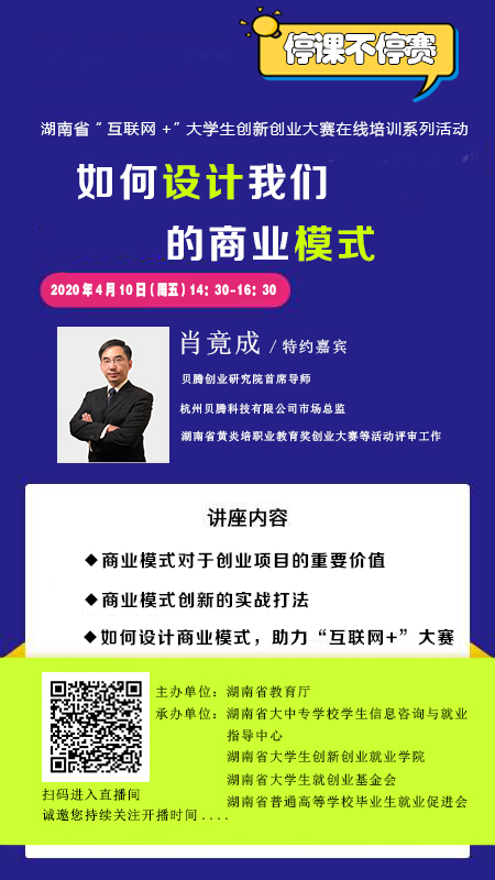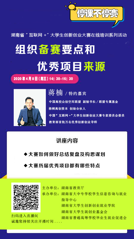 湖南省“互联网+”大学生创新创业大赛组委会将从本周开始进行创新创业大赛线上培训,大赛组委会秘书处将邀请全国知名专家以在线互动等形式,指导全省各高??勾葱麓匆到逃萄Ш脱盗肥导?,做好”第六届中国国际‘互联网+’创新创业大赛“全国选拔赛的备赛工作,请大家准时收看??纬淘じ妫?br>直播链接:https://ke.qq.com/webcourse/index.html?cid=1403982&term_id=101501573&lite=1&from=800021724