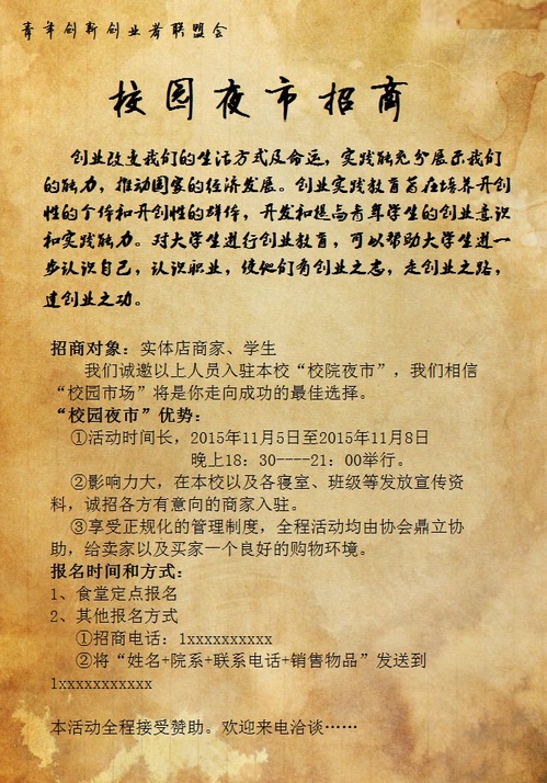 为了给大家一个创业实践展示才华的平台就业与创业指导中心与创新创业团队特推出“校园博览会”项目,为进一步发挥其项目职能与规范市场特对报名者做如下要求: