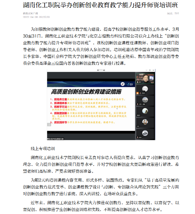 为加强教师创新创业教育教学能力建设,提高学校创新创业指导服务工作水平,3月30至31日,湖南化工职业技术学院与北京志恒教育科技有限公司联合主办线上“创新创业教育教学能力提升专项师资培训班”,该校创新创业课程任课教师、创新创业项目指导老师、创新创业工作相关人员共98人参加培训。培训班邀请原中国青年政治学院副院长李家华、中国社会科学院大学创新创业研究中心主任王艳茹、教育部就业创业指导委员会委员高泽金三位国内著名创新创业教育专家进行授课。