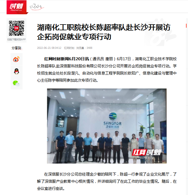 红网时刻新闻6月20日讯(通讯员 唐丽)6月17日,湖南化工职业技术学院校长陈超率队赴深信服科技股份有限公司长沙分公司开展访企拓岗促就业专项行动。学校招生就业处处长段楚凡、自动化与信息工程学院院长欧阳广、信息化建设与管理中心主任陈宇等陪同参加此次专项行动。