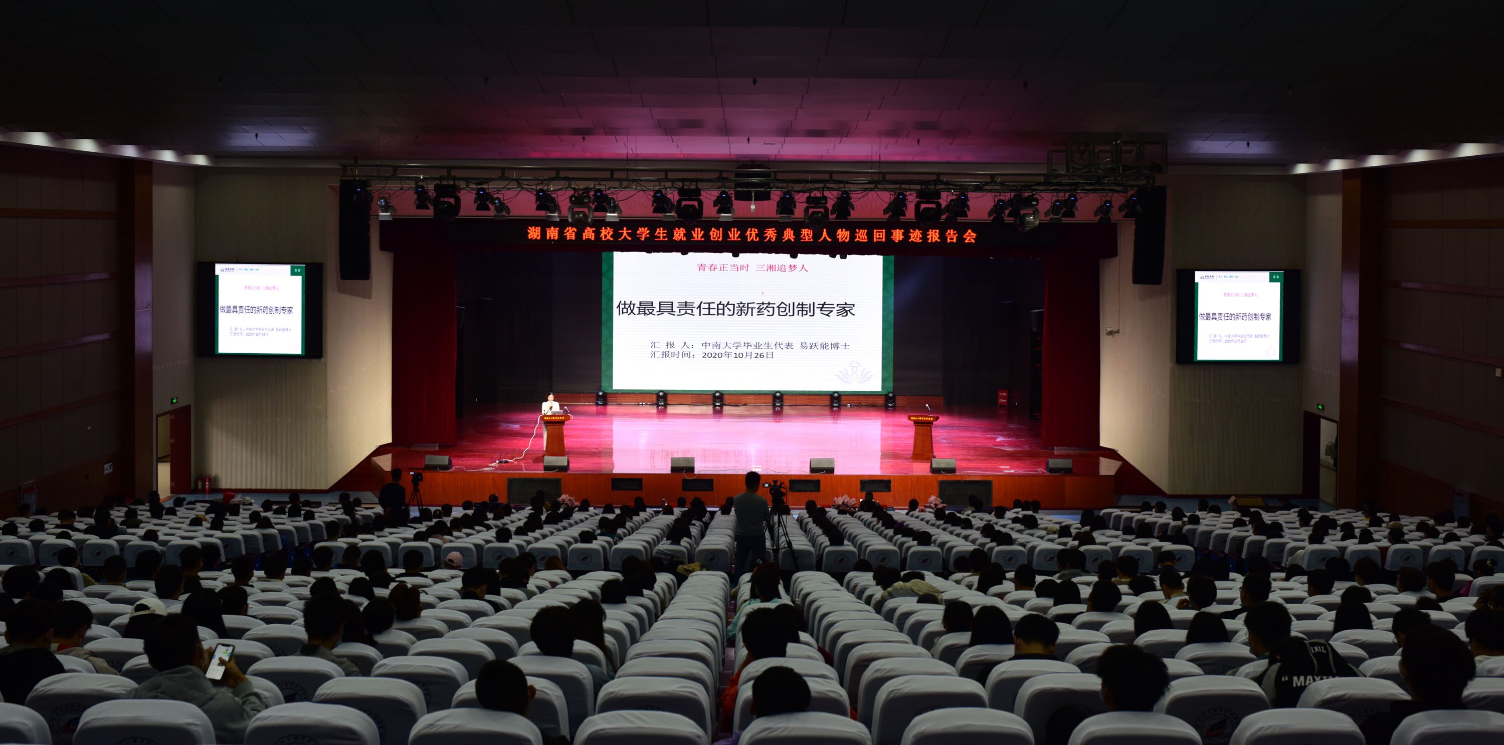 报告会现场,中南大学药物分析学博士、湖南易能生物医药有限公司创始人易跃能的“责任与创新”故事、长沙学院赵瑱涵扎根基层的故事、湖南科技学院李国琛的“6次创业经历”、湘潭医卫职院罗晨阳驰援湖北的抗疫故事、湖南医药学院王红伟在全国开创1200家果缤纷门店的故事,都深深打动了各高校的大学生们。他们的金句“大学里踏实学习,培养日后创业基础”“先就业,学一身本事再创业”“有仰望星空的胆魄,有匍匐前行的勇气,创造有价值的人生”“功成不必在我,功成必定有我”给大学生们以启迪,会场响起阵阵热烈的掌声。