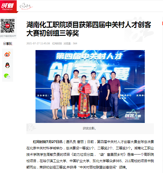 红网时刻7月27日讯(通讯员 唐丽)日前,第四届中关村人才创客大赛全球总决赛在北京中关村科学城举办,总决赛设一等奖1个、二等奖2个、三等奖3个。湖南化工职业技术学院学生周敏负责的项目《助力垃圾分类,“袋”富美丽乡村》是唯一一个高职院校项目,在哈尔滨工业大学、中国矿业大学、东北大学等众多985、211高校的项目中脱颖而出,荣获初创组三等奖,并获得“中关村百校联盟创客空间”颁牌。