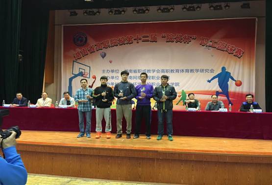 2016年4月24日,第十二届湖南省高职学院“院长杯”篮球赛在湖南网络职业技术学院圆满结束,本次比赛共有全省11支高职院校组队参加,分为两个小组先进行双循环赛,再根据小组排名打交叉淘汰赛,最终确定总排名。 在为期十多天的比赛中,我院教职工篮球队的队员们在许多校领导的参与和激励下,在教练的指挥下个个激情满怀,众志成城,积极做好比赛准备,了解并讨论各个对手的技术特点和应对措施;比赛时,队员们迅速融入比赛,个个英姿勃发、激情四射,与对手争锋相对,一轮轮的进攻与防守,争夺得格外激烈。特别是王雄伟校长在百忙之中亲临比赛现场为队员们鼓劲加油,更加激励了全体队员的坚强意志和拼搏精神,比赛取得了良好的成绩。