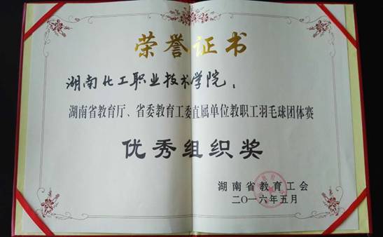 为增加省教育厅直属单位之间的沟通与交流,丰富教职员工的业余文化生活,由湖南省教育工会举办的“2016年湖南省教育厅、省委教育工委直属单位教职工羽毛球团体赛”于5月19日晚在长沙民政职业技术学院体育馆落下帷幕。来自省教育厅直属单位的省教育厅机关、湖南化工职业技术学院等27个单位的教职工代表队参加了比赛。比赛采用混合团体赛制,每场比赛共设男女混合双打、男子单打、女子单打、男子双打、女子双打五个项目。此次比赛我院派出男女各五名教职工代表,经过为期半个月的辛苦集训,我院代表队在本次省教育厅直属单位羽毛球赛中取得了较好成绩,在小组赛中,获得D组第一名,在四分之一交叉淘汰赛中以1比3输给东道主民政职院队,最后获得了本次大赛的优秀组织奖。