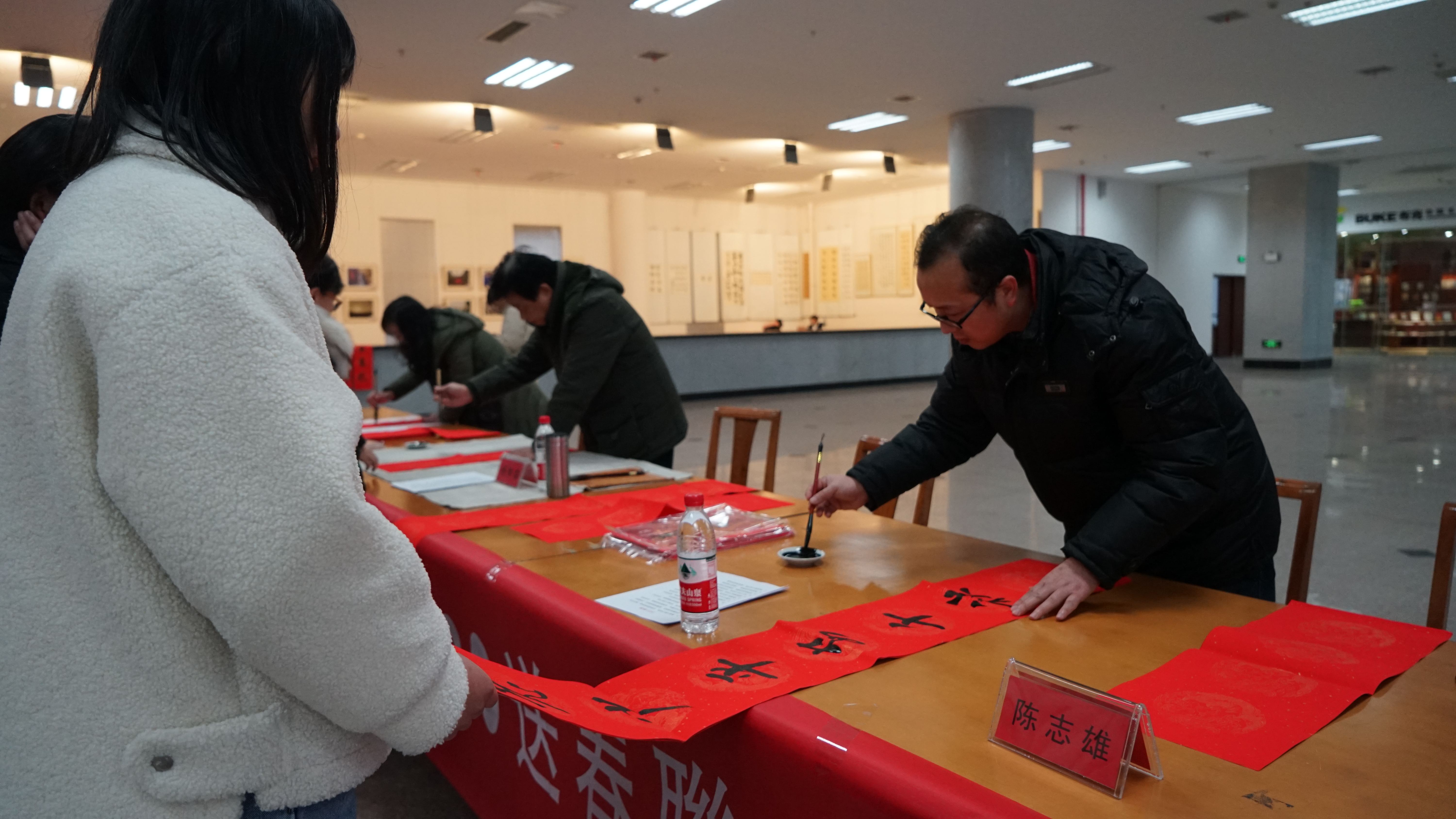 1月2日,湖南化工职业技术学院在学校图书馆一楼大厅举行“墨香校园”春联书写赠送活动暨文化惠民2020年送春联活动,营造新年节日氛围,弘扬中国传统文化,打造书香校园?;疃墒榉液脱J榉ㄐ嵬殖』雍粒鲜屯强勺阅饬?,亲自书写或由书法家现场代写,书写的春联在图书馆一楼集中展示,供学校老师免费领取,将吉祥喜庆带回家。