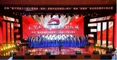 为庆祝中华人民共和国成立70周年,讴歌祖国的伟大成就,由株洲市职教园管理办、市教育局、市总工会、共青团株洲市委等单位联合举办的“礼赞新中国·放歌职教城”湖南(株洲)职业教育科技园庆?!靶轮泄闪?0周年暨职教科技园建园10周年职业院校教师合唱比赛在我院隆重举行。