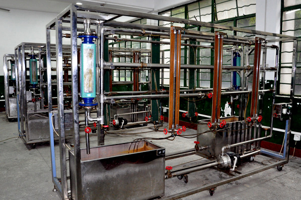 化工单元操作流体阻力实训室位于学院北区的教学楼一楼主102;有6套化工单元操作流体阻力实验装置,每套实验装置拥有水泵、蓄水箱、沿程阻力光滑管、沿程阻力粗糙管、局部阻力管、压差计、流量计、阀门、实验台架及电控箱。总价值约15万元左右,实训设备和药品管理规范,实验开出率达到100%;化工单元操作实训主要面向应用化工技术、精细化学品生产技术、高聚物生产技术、有机化工生产技术、工业分析与检验、化学制药技术、生物化工工艺及冶金化工生产技术等8个专业服务,能够满足化学工程系和应用化学系化工单元操作实训教学的需求。