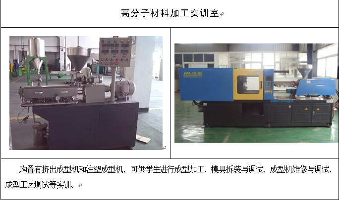 购置有挤出成型机和注塑成型机,可供学生进行成型加工、模具拆装与调试、成型机维修与调试、成型工艺调试等实训。