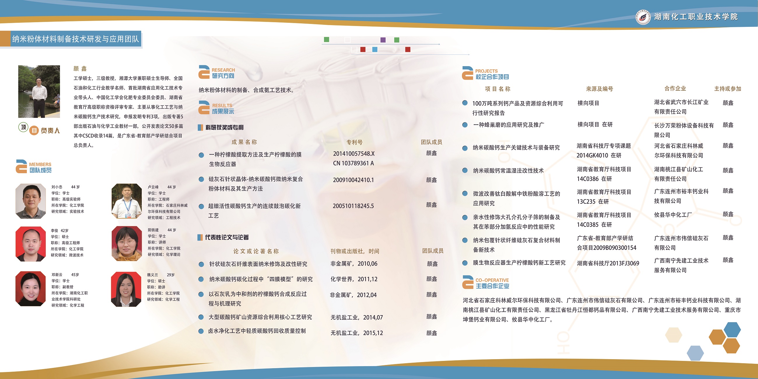 纳米粉体材料技术研发与应用项目室,团队校企研发人员共7人 ,成员包括企业工程技术人员及化学工程学院中青年教师,依托工业中心化工生产中试车间,纳米碳酸钙制备与改性中试装置,从事纳米碳酸钙表面活化改性,解决碳化塔、活化工艺设备可控的共性与关键技术研发与推广。