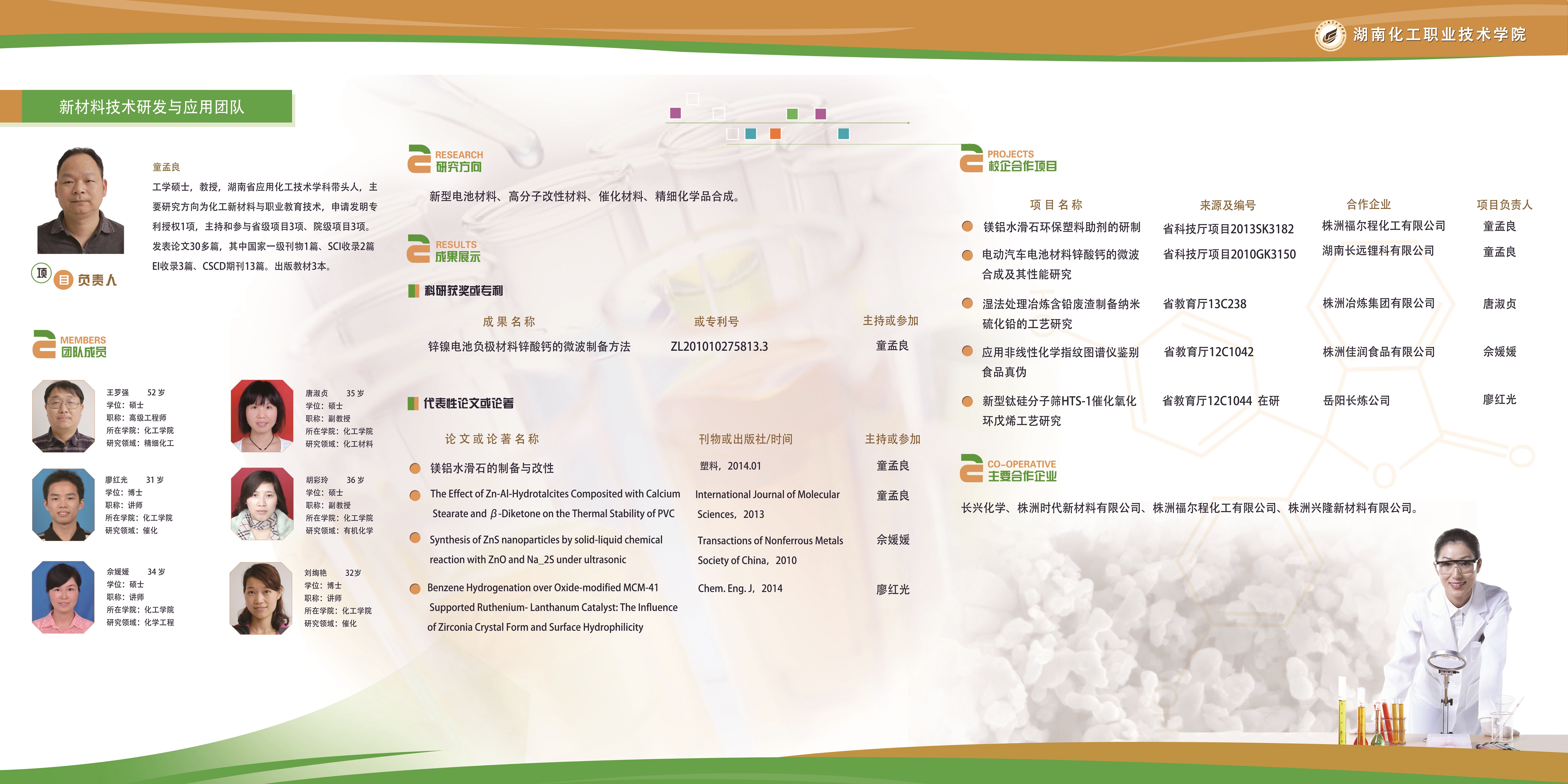 新材料技术研发与应用项目室,团队研发人员共7人,组成人员为化学工程学院骨干教师和企业高级技术人员,依托应用化工技术中心、化工单元实训中心、煤制甲醇工厂、高分子材料检测中心,从事化工新材料,特别是有机硅、有机氟、工程塑料等在新能源、汽车行业、节能环保领域的应用,化工催化新材料的制备研发与推广。