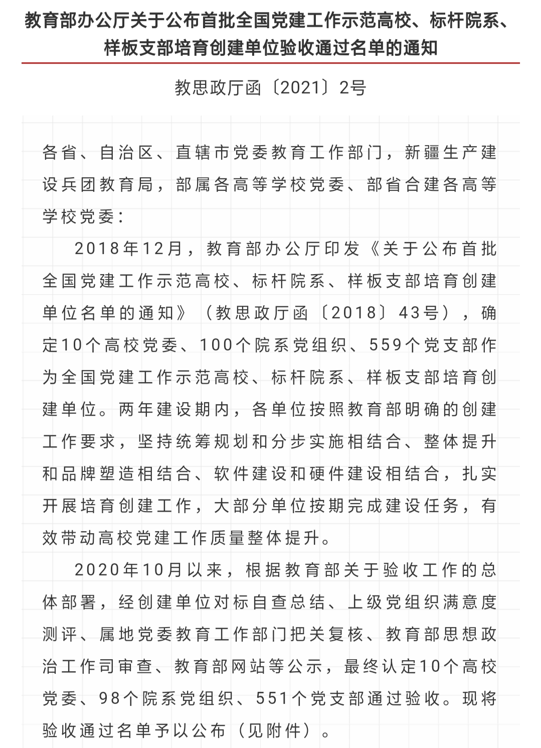 1月26日,教育部办公厅印发《关于公布首批全国党建工作示范高校、标杆院系、样板支部培育创建单位验收通过名单的通知》(教思政厅函﹝2021﹞2号),学院顺利通过全国党建工作示范高校培育创建验收。