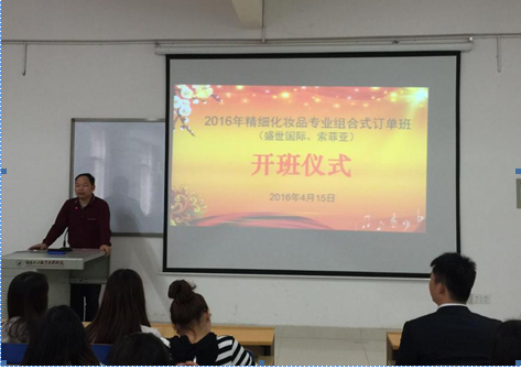 4月15日下午两点,香港盛世国际集团有限公司、湖南索菲亚健康咨询有限公司与我院共同开办的精细化妆品专业首届组合式订单班开班仪式顺利举行?;Чこ萄г涸撼ね狭冀淌?、香港盛世国际集团有限公司总经理刘宏、湖南索菲亚健康咨询有限公司人力资源部经理黄中华、精细化妆品专业负责人祖帅老师、订单班班主任尹琦老师以及订单班的全体学生参加了仪式。