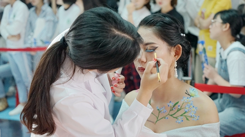 大赛分“美容技法大赛”和“美妆设计大赛”两个项目,参赛选手要完成实践操作和理论知识的两方面考核,只有技能过硬、知识牢固的选手才能脱颖而出。比赛期间还安排了素人改造环节,诚挚邀请SN'SUKI韩李闯老师在现场选择一位幸运观众打造时尚造型,让同学们能学习到更专业的美妆手法。素人改造环节结束后,经过美妆组选手的巧手描绘,模特们伴随音乐款款而行,把比赛气氛推向高潮。