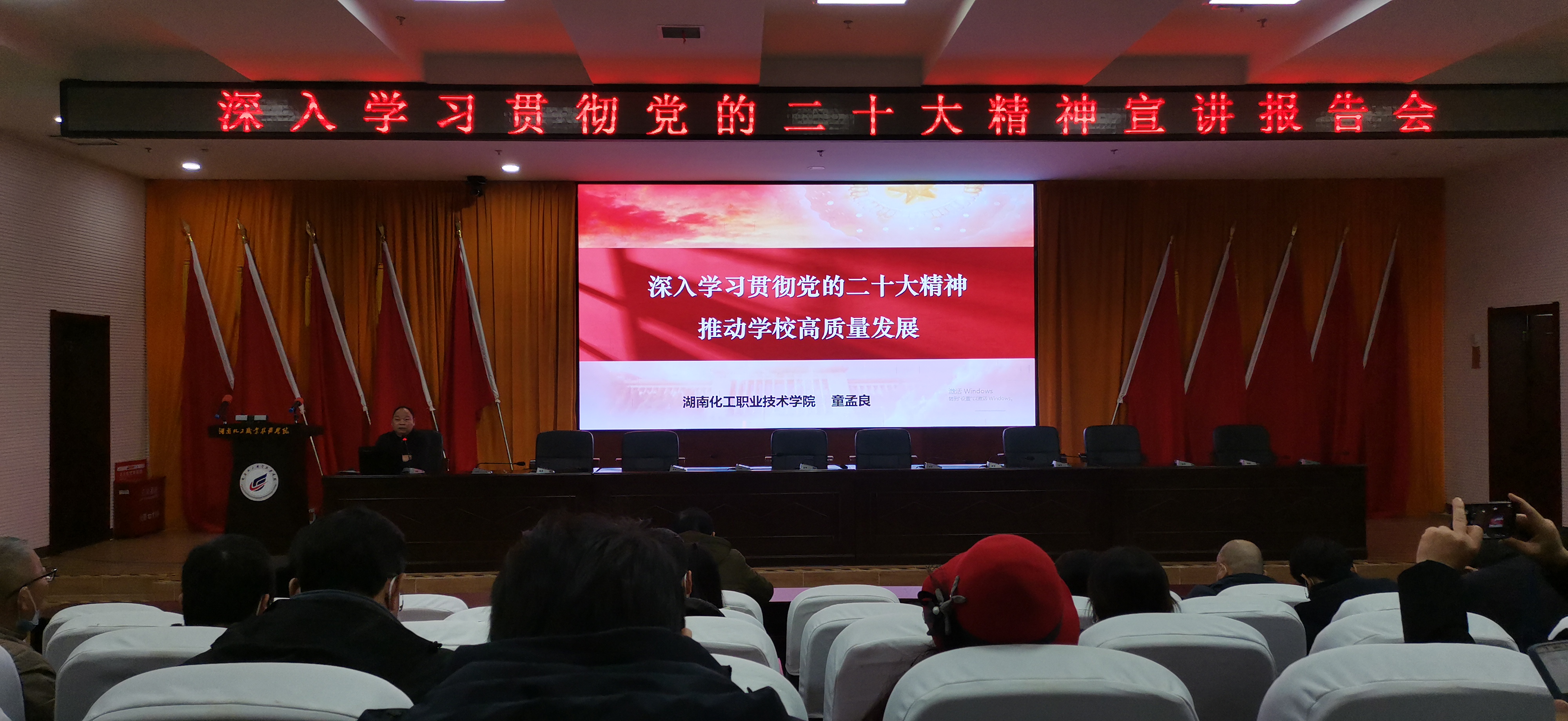 12月6日下午,在图书馆报告厅,童孟良以“深入学习贯彻党的二十大精神 推动学校高质量发展”为主题给学院全体教师做宣讲。他从提高政治站位,深刻认识党的二十大的重大意义;持续学深悟透,切实担当职业教育的责任与使命;踔厉奋发真抓实干,推动党的二十大精神贯彻落实三个方面深入解读党的二十大精神。他指出,党的二十大报告从全局高度统筹职业教育高质量发展。我们一定要把握发展机遇,特别是创办职教本科的机遇,要直面现实挑战,找准破题之策。