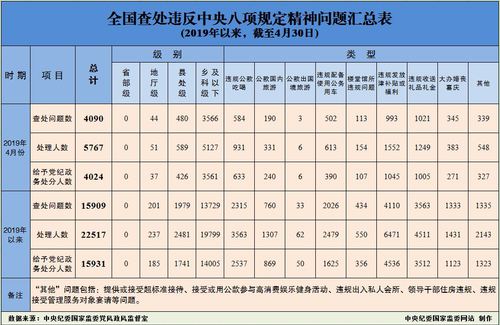 为掌握全国贯彻落实中央八项规定精神情况,中央纪委在各省区市和新疆生产建设兵团、各中央和国家机关、各中央企业和中央金融企业等建立了落实中央八项规定精神情况月报制度。2019年以来,截至4月30日,全国查处违反中央八项规定精神问题情况如下: