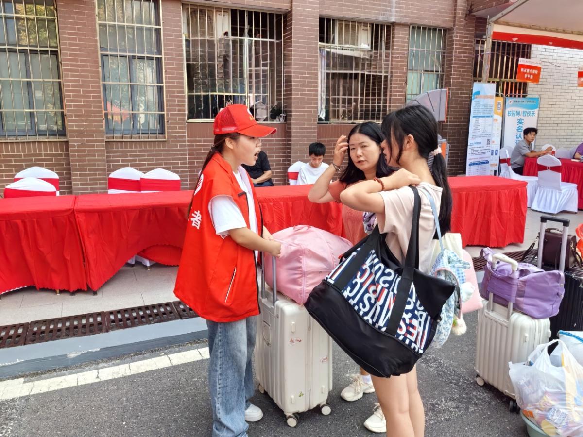 在现场,身着志愿服的学生志愿者成为迎新点最亮眼的风景线。他们不畏酷暑,穿梭在迎新点与宿舍之间,不仅认真细致地为家长讲解报到步骤、校园布局,还主动接过新生和家长手中沉甸甸的行李,一路护送引导,让初来乍到的新生感受到了家一般的温暖。