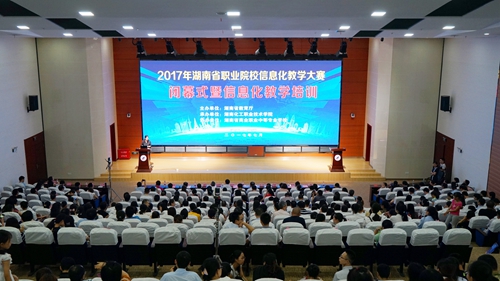 7月18日上午,由湖南省教育厅主办、湖南化工职业技术学院承办、湖南省商业职业中等专科学校协办的2017年湖南省职业院校信息化教学大赛闭幕式暨信息化教学培训在湖南化工职业技术学院图书馆二楼学术厅举行。闭幕式由湖南省教育厅职成处副处长周韶峰主持,分管职业教育的省教育厅副厅长应若平教授到会颁奖并讲话。