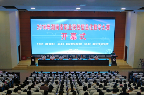 2016年全省职业院校信息化教学大赛开幕式于9月9日下午在湖南化工职业技术学院图书馆学术报告厅隆重举行。省教育厅副厅长应若平、省教育厅信息化办主任周芳友、省教育厅职业教育与成人教育处副处长朱日红、周韶峰、湖南化工职业技术学院党委书记刘望、校长王雄伟及大赛全体领队和参赛选手近500人参加了开幕式。朱日红主持开幕式。