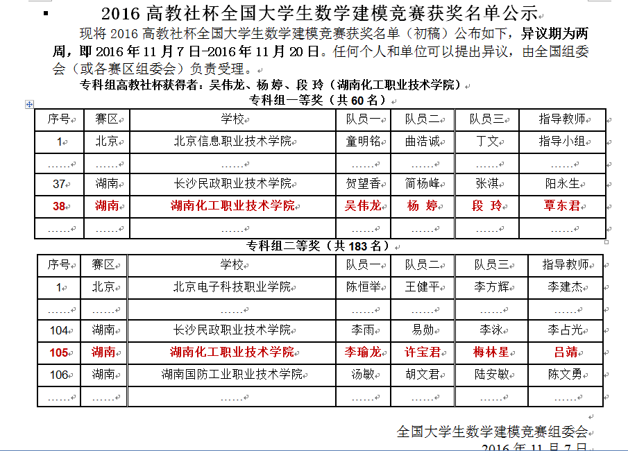 热烈祝贺数学教研室指导学生参加全国数学建模竞赛再创辉煌,我院学子在2016高教社杯全国大学生数学建模竞赛中获得国家一等奖一项(参赛学生:吴伟龙、杨 婷、段 玲 指导教师:覃东君);获国家二等奖一项(参赛学生:李瑜龙、许宝君、梅林星 指导教师:吕静);特别的是:吴伟龙、杨婷、段玲组获得专科组高教社杯,系这项全国赛事以来湖南首次获得高教社杯。