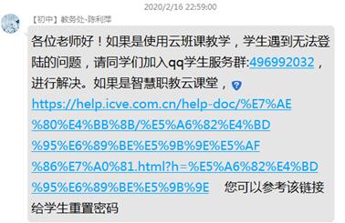 “各位老师好!如果是使用云班课教学,学生遇到无法登陆的问题,请同学们加入qq学生服务群,我将协助进行解决,如果是智慧职教云课堂,您可以参考该链接给学生重置密码?!背吕祭鲜σ恢痹诮淌θ豪镂蠹姨峁┬畔⒓际跤τ煤徒萄教ㄓτ弥傅迹墙涛翊萄г诵懈谖坏吃苯淌ぷ髯ò嗟囊辉?。