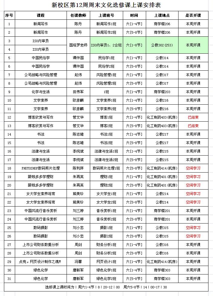 2016-2017第一学期新校区第12周周末文化选修课上课安排表