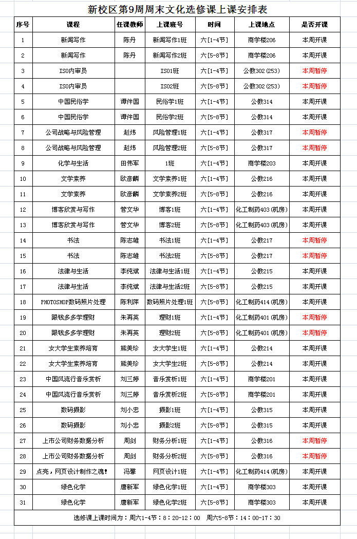 2016-2017第一学期新校区第9周周末文化选修课上课安排表