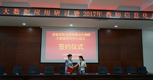 下午,我校与北京智启蓝墨信息技术有限公司合作成立“湖南省职业院校移动云教学大数据研究中心”。签约仪式在图书馆报告厅举行,由教务处处长田伟军主持,隆平副校长与北京蓝墨云教学大数据研究院院长商桑教授现场互签协议。