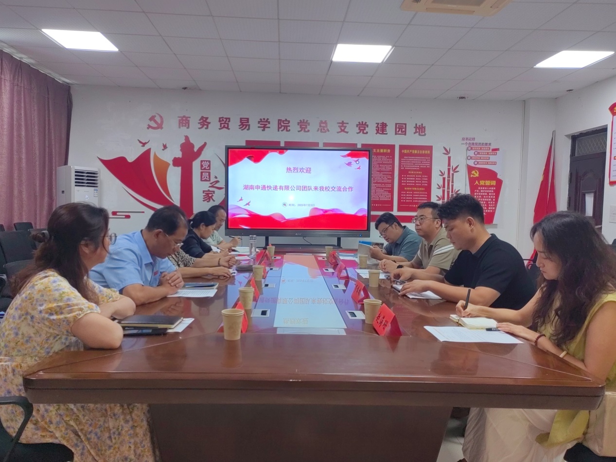 7月3日,湖南申通快递有限公司人资负责人陈国超、招聘经理罗梓雄一行来校就共建“申通仕官生订单班”等合作项目进行深入洽谈。学校校企合作处处长肖虹、商务贸易学院班子成员、现代物流管理专业负责人等参加交流会。