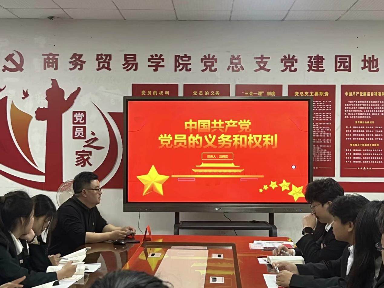 4月8日,商务贸易学院党总支副书记温拥军在励志楼136会议室为2025年第一期入党积极分子培训班学员讲授专题党课。