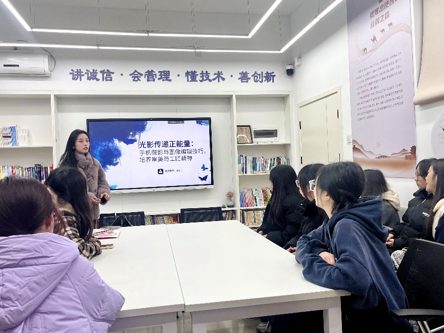 12月10日,商务贸易学院教工支部“映‘商’红育人坊”第七期活动在2栋唯真苑“一站式”学生服务社区举行。商贸学院教工支部党员教师刘琴心以“光影传递正能量——手机摄影与图像编辑技巧”为主题,组织学院入党积极分子学习手机摄影和图像编辑的技巧,培养学生的审美能力和工匠精神,进一步丰富校园文化生活。