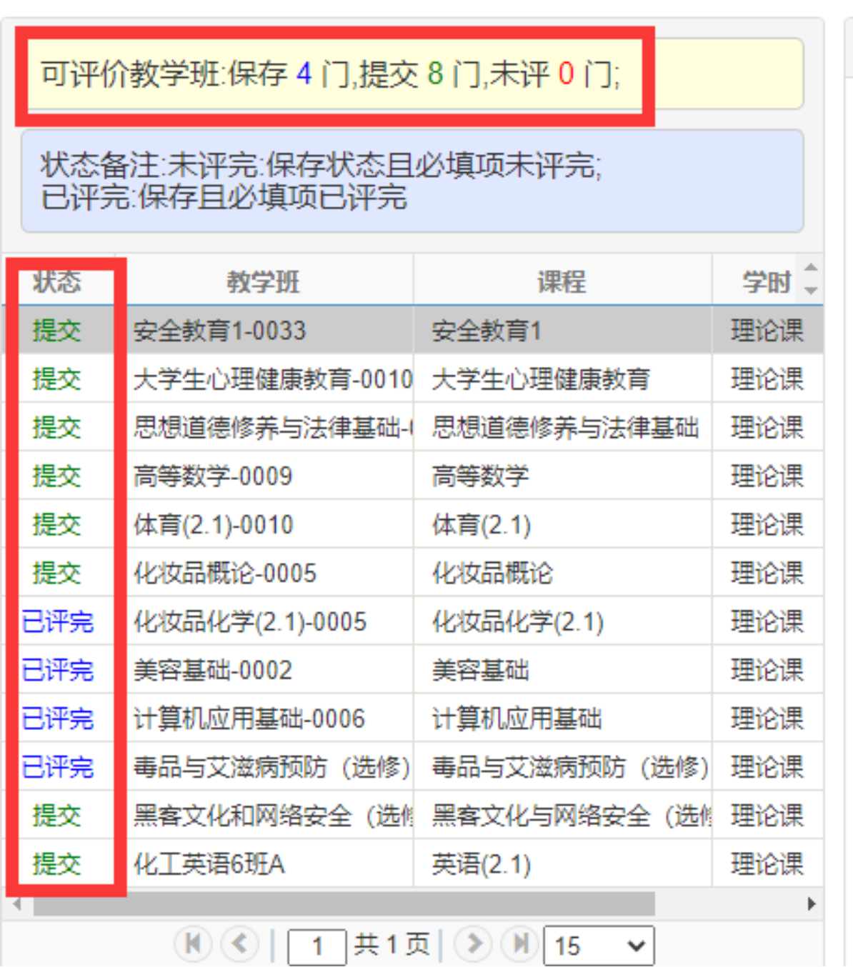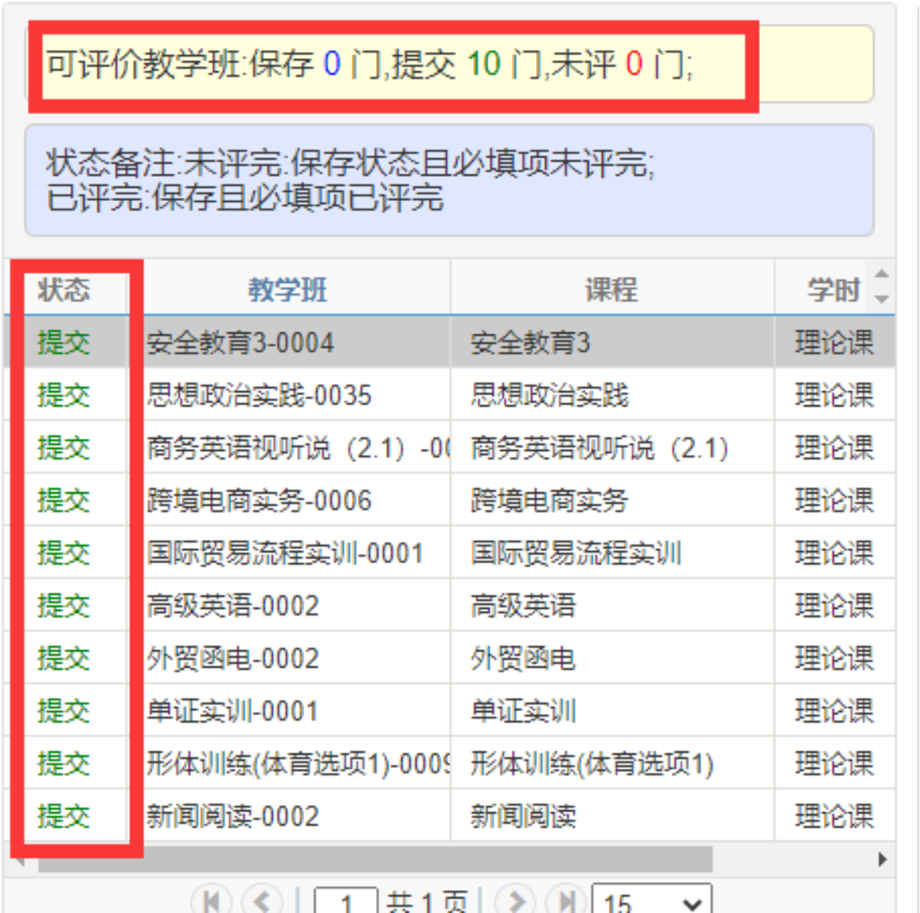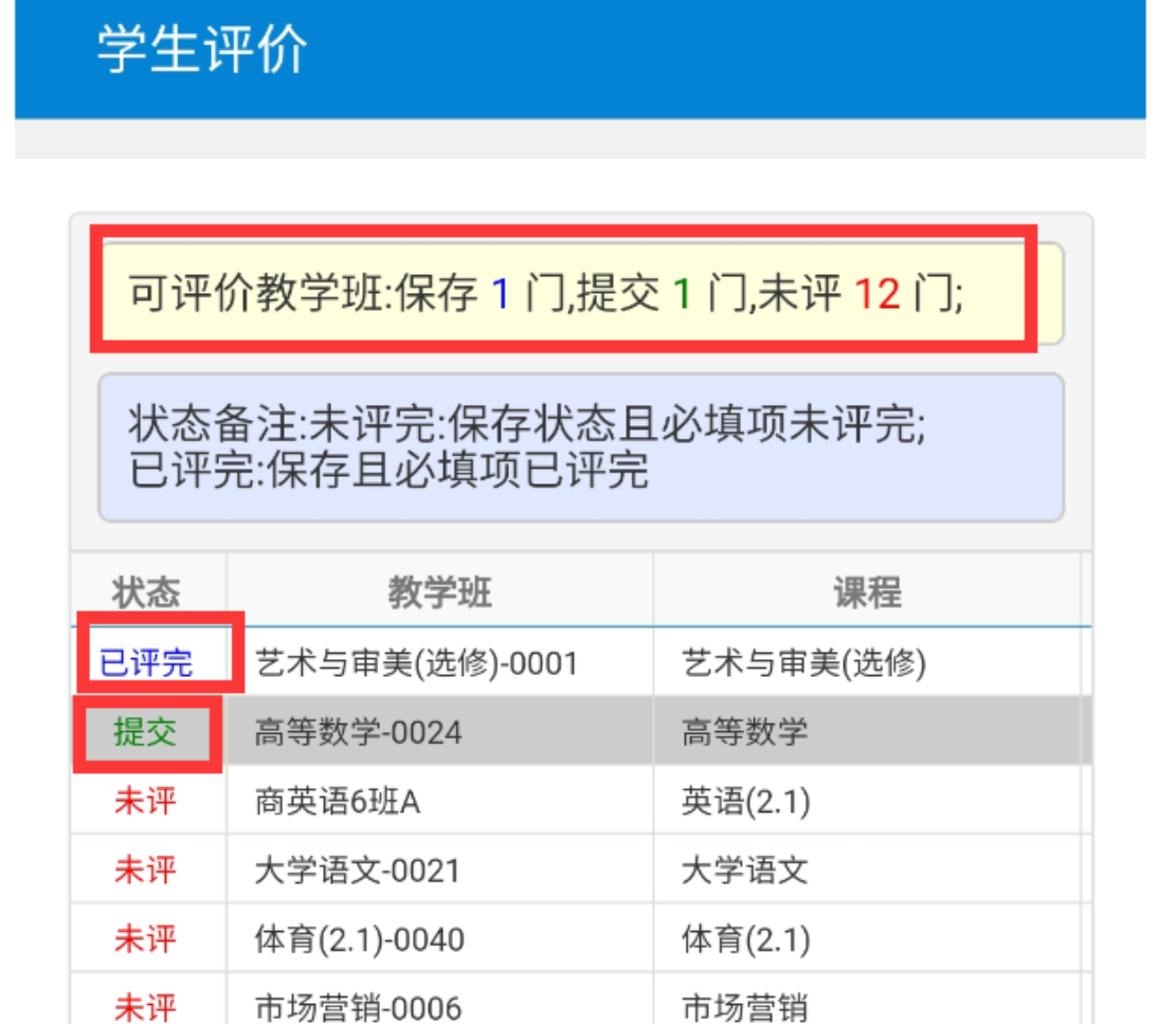 3.在学生评价中,特别要注意查看顶部黄色背景的状态栏,有三种颜色表示不同状态:蓝色:表示已评完但未提交,还可以进行修改。绿色:表示已经提交,不可修改。红色:表示还未评价。