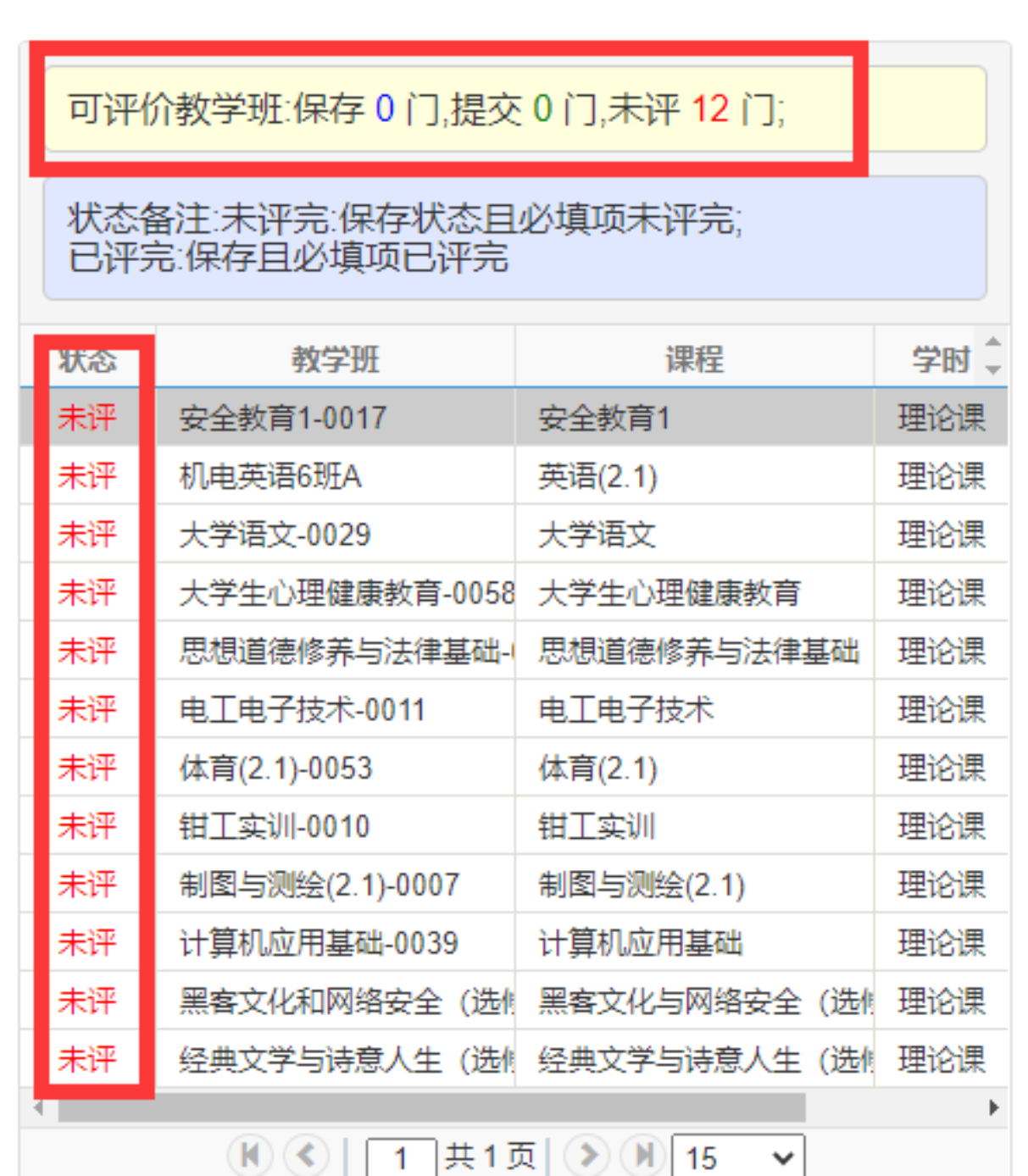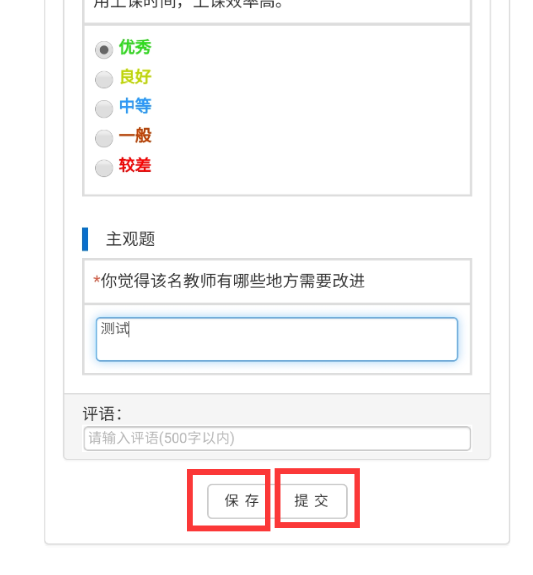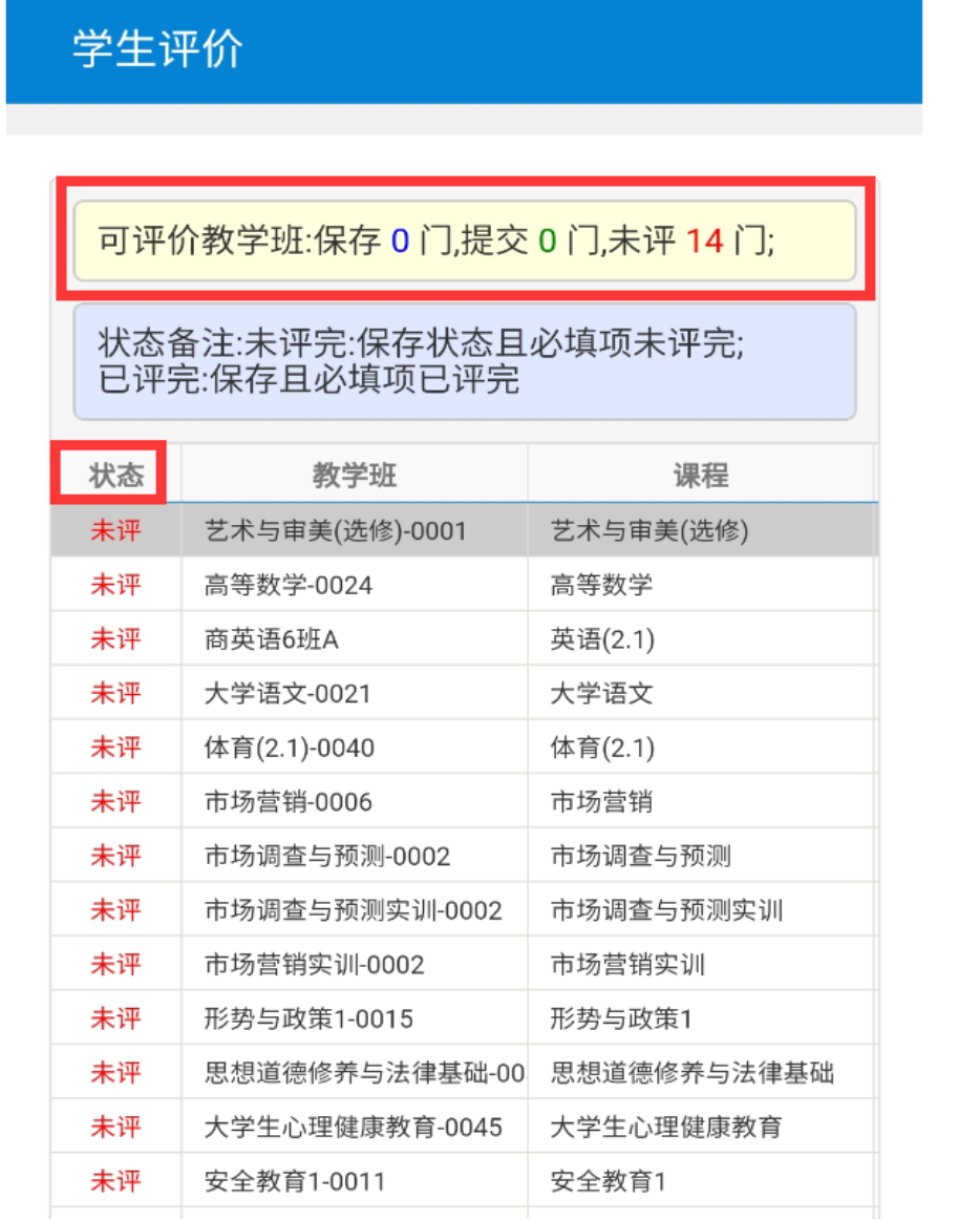 3.在学生评价中,特别要注意查看顶部黄色背景的状态栏,有三种颜色表示不同状态:蓝色:表示已评完但未提交,还可以进行修改。绿色:表示已经提交,不可修改。红色:表示还未评价。