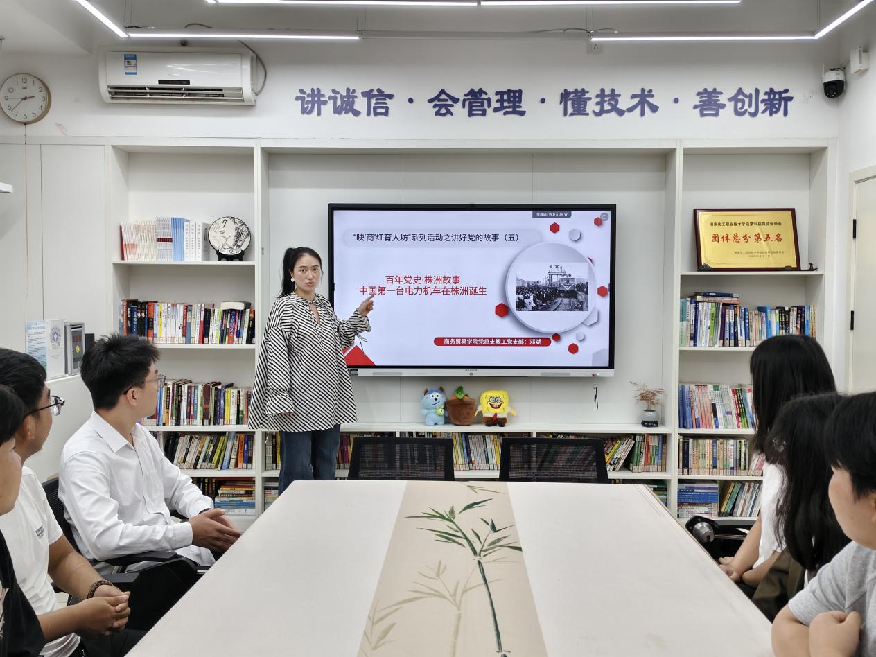 5月29日下午,商务贸易学院党总支教工党支部开展第五期“映‘商’红育人坊”系列活动。本期活动以“百年党史·株洲故事——株洲故事:中国第一台电力机车在株洲诞生”为主题,旨在引导学生感悟中国共产党领导下的科技自立自强精神。活动由学院教工支部党员邓湖主讲,学院全体入党积极分子参加。