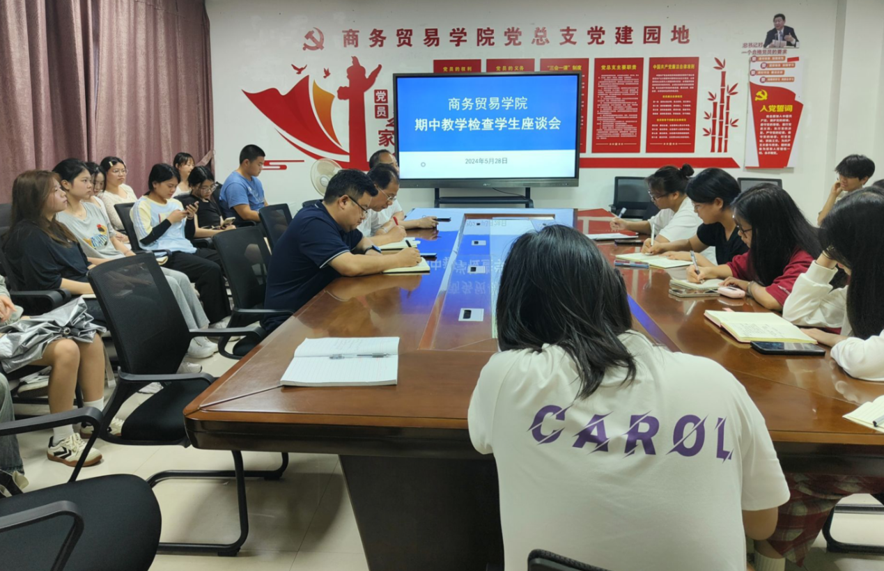 5月28日下午,在励志楼136会议室召开商务贸易学院期中教学检查学生座谈会,会议由商务贸易学院教学副院长向林峰主持,商务贸易学院党总支书记严可为、党总支副书记温拥军、教学干事谭敏出席座谈会。来自商务贸易学院22、23级的34个班级的学习委员参加了座谈会。