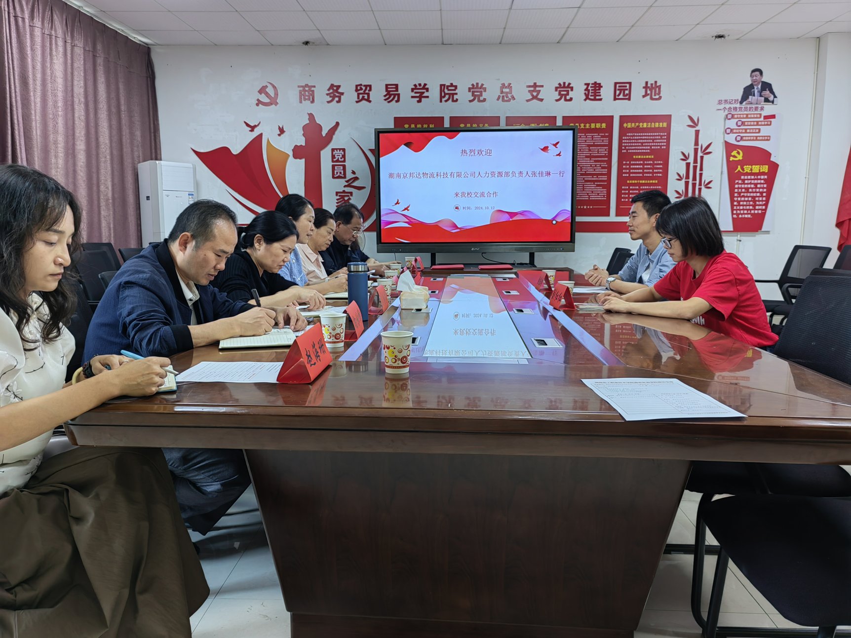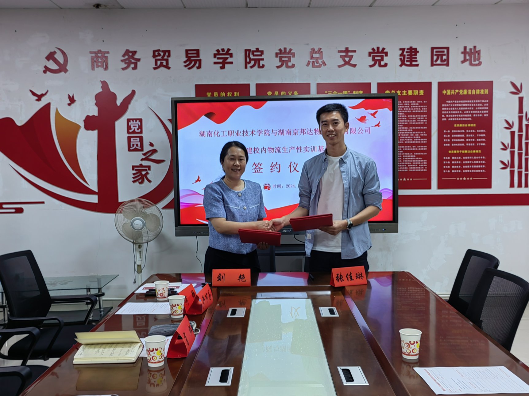 10月12日,我校与湖南京邦达科技有限公司共建校内生产性实训基地签约仪式在励志楼136会议室举行。湖南京邦达科技有限公司人力资源部负责人张佳琳及校企合作经理刘红红,学校党委委员、副校长刘艳,校企合作处处长肖虹,商务贸易学院院长莫兼学,党总支书记严可为,副院长向林峰、何静,现代物流管理专业负责人赵海珊等参加签约仪式。签约仪式由莫兼学主持。