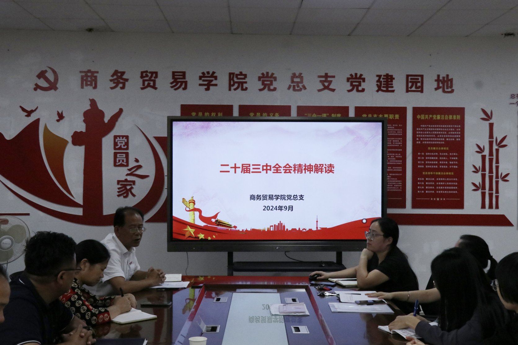9月24日下午,商务贸易学院党总支组织全体党员集体学习中国共产党二十届三中全会精神,研讨如何落实会议精神,突出以学生为本,不断加强素质教育,促进全体学生全面发展的新思路、新举措。商贸学院党总支书记严可为主持会议。
