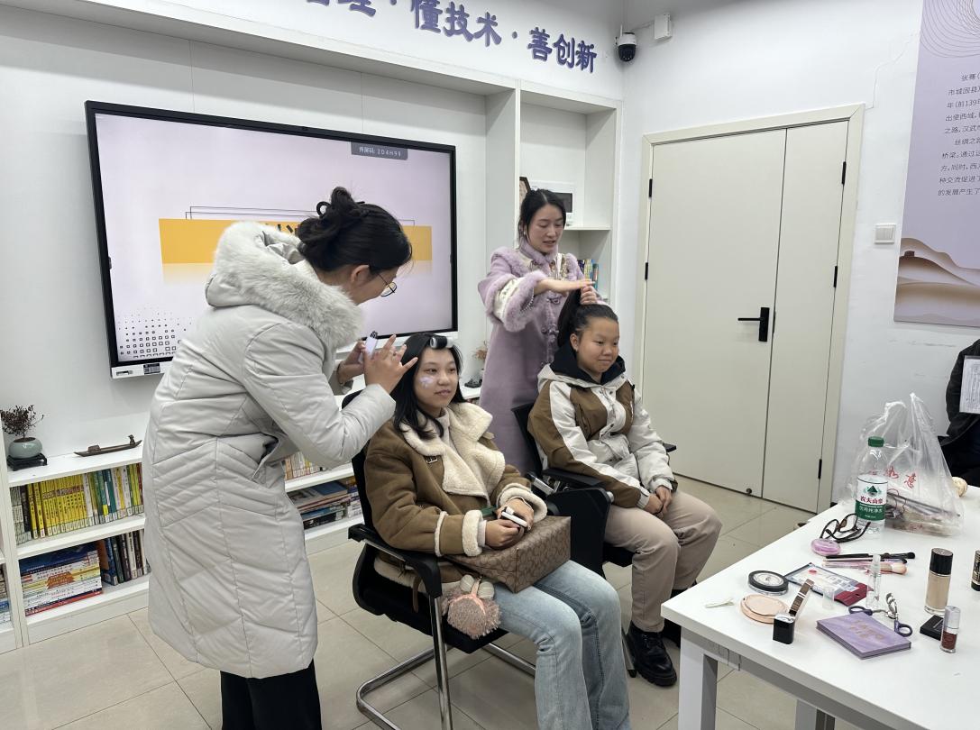 最后的互动环节,现场气氛非?;钤?,两位老师随机选取了两位同学,为她们化妆与头饰造型,并为其余同学们分发发簪等礼物。