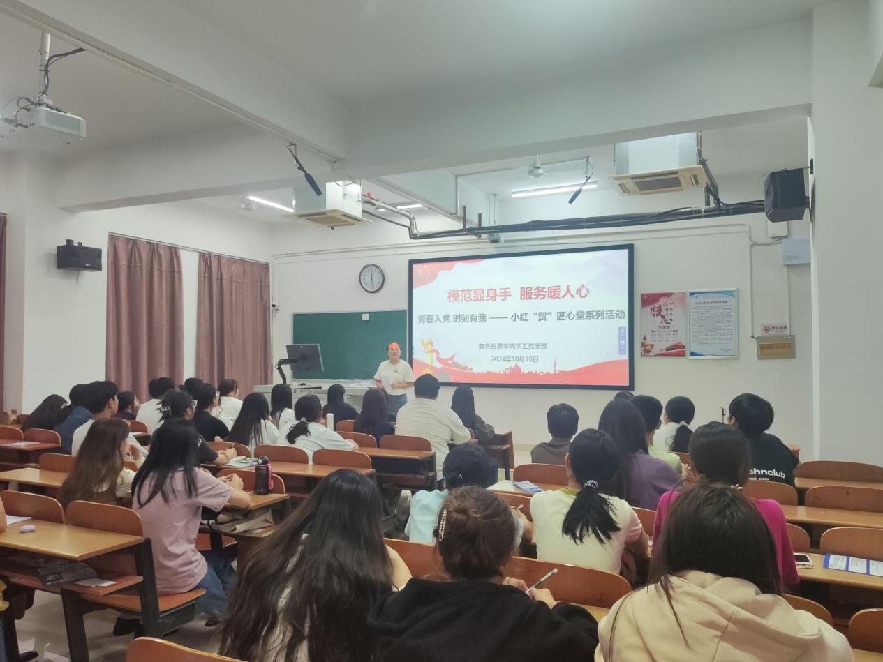 在金秋送爽、桂花绽放的温馨时刻,商务贸易学院学工党支部于10月10日组织了以“模范显身手,服务暖人心”为主题的青春入党,时刻有我——小红“贸”匠心堂活动,旨在激发学院入党积极分子的入党热情,深化他们的服务意识,强化党员的责任感与使命感,同时传承“心系人民,奉献社会”的崇高党员精神。学院第18期全体入党积极分子参加此次活动?;疃缮涛衩骋籽г貉Чさ持Р渴榧峭踯坝敝鞒帧?/p>