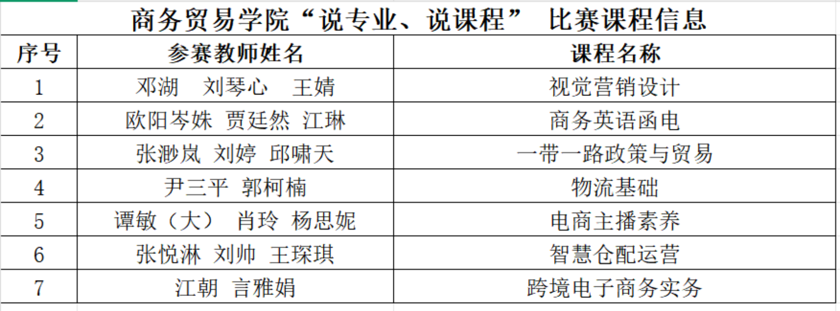 比赛伊始,先按照抽签结果,参赛的7支队伍依次完成时长10分钟的“说课程”讲解。在10分钟的“说课程”阐述环节,7位教师各施才能,课堂教学特色鲜明,教学案例制作精良,PPT展示内容丰富,以生动流畅的语言、良好的教学素养赢得评委和观摩教师的一致好评。比赛的7支队伍及参赛课程信息如下图所示: