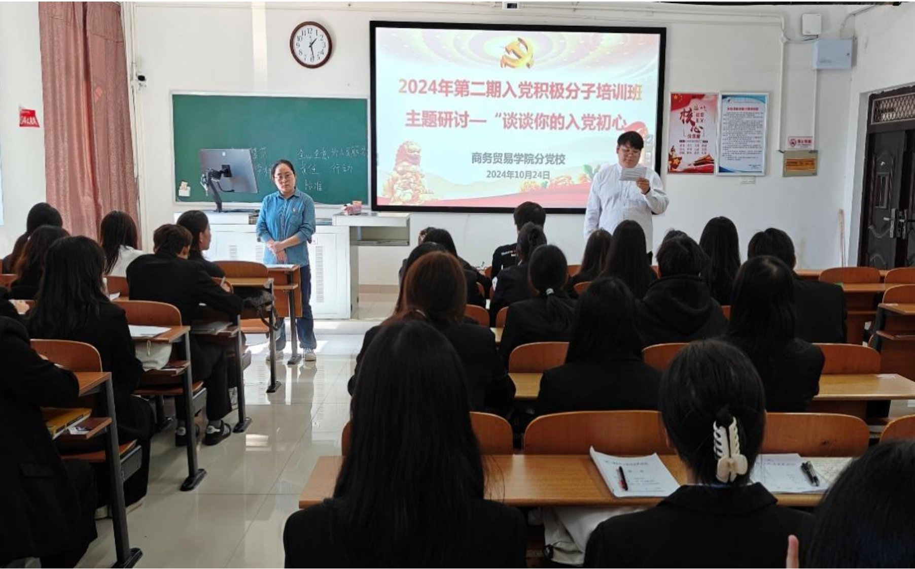 为深化入党积极分子对党的认识,促使其树立正确的入党动机、营造良好党性教育氛围,商务贸易学院分党校于10 月24日,在励志楼 217开展主题为“谈谈你的入党初心”的研讨活动。54名入党积极分子全员参加,其中23级现代物流管理专业外出实训的入党积极分子同时进行线上研讨?;疃缮涛衩骋籽г貉ЧぶР渴榧峭踯坝敝鞒?。