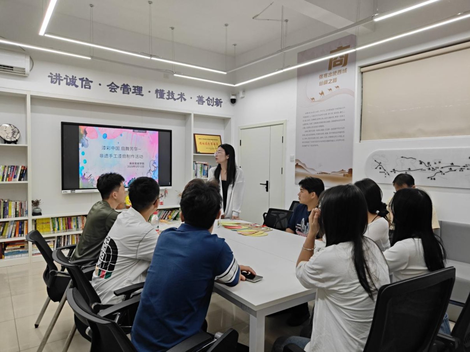 5月12日,为弘扬传统文化,丰富学生的精神文化生活,商务贸易学院党员老师胡文梅、魏阳向在唯真苑一站式社区院开展 “漆彩中国 扇舞风华”手工漆扇体验实践活动,带领入党积极分子代表深入领略中华文化的独特魅力,并让大家亲自动手参与到漆扇制作中,在实践里感悟传统艺术的深厚底蕴。