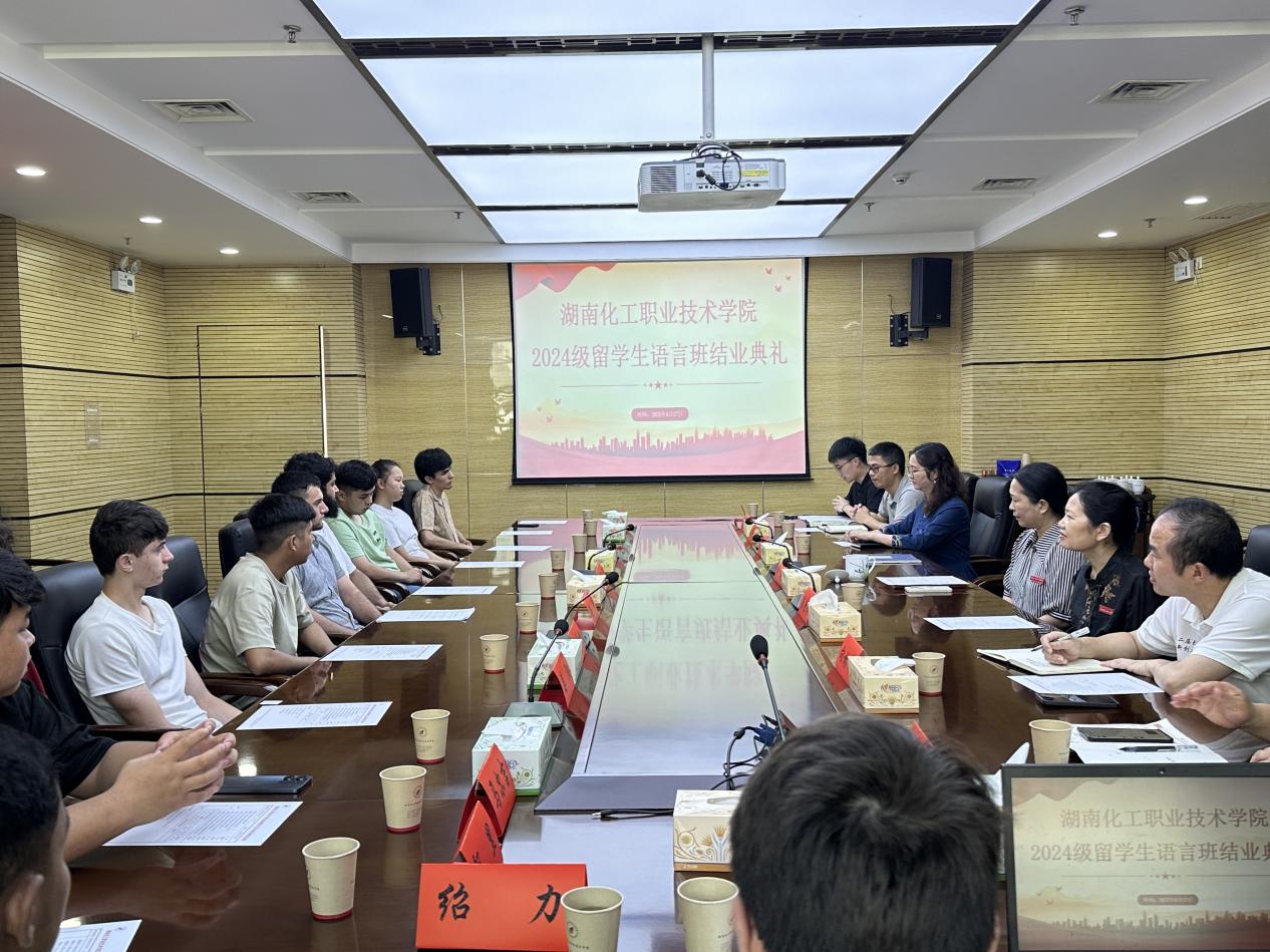 6月27日上午,我校2024级留学生语言班结业典礼在上善楼309会议室举行。学校副校长刘艳出席典礼并讲话。商务贸易学院班子成员,对外交流处副处长赖春明,商务英语教研室主任刘婷,留学生辅导员邱啸天及全体语言班留学生参加典礼。典礼由商务贸易学院院长莫兼学主持。