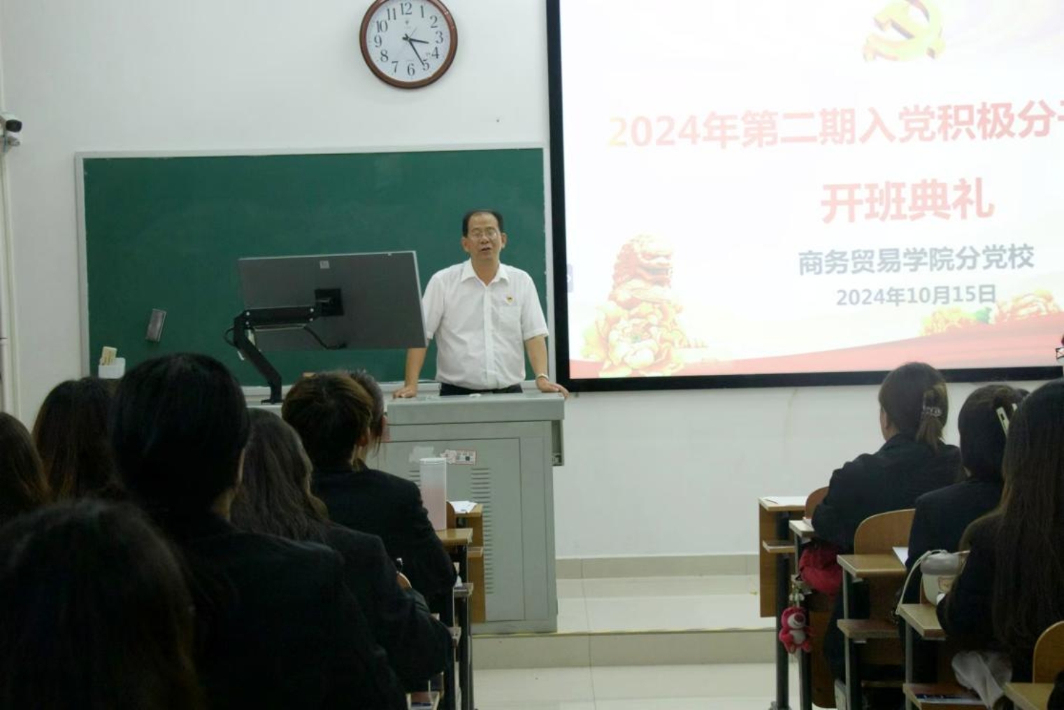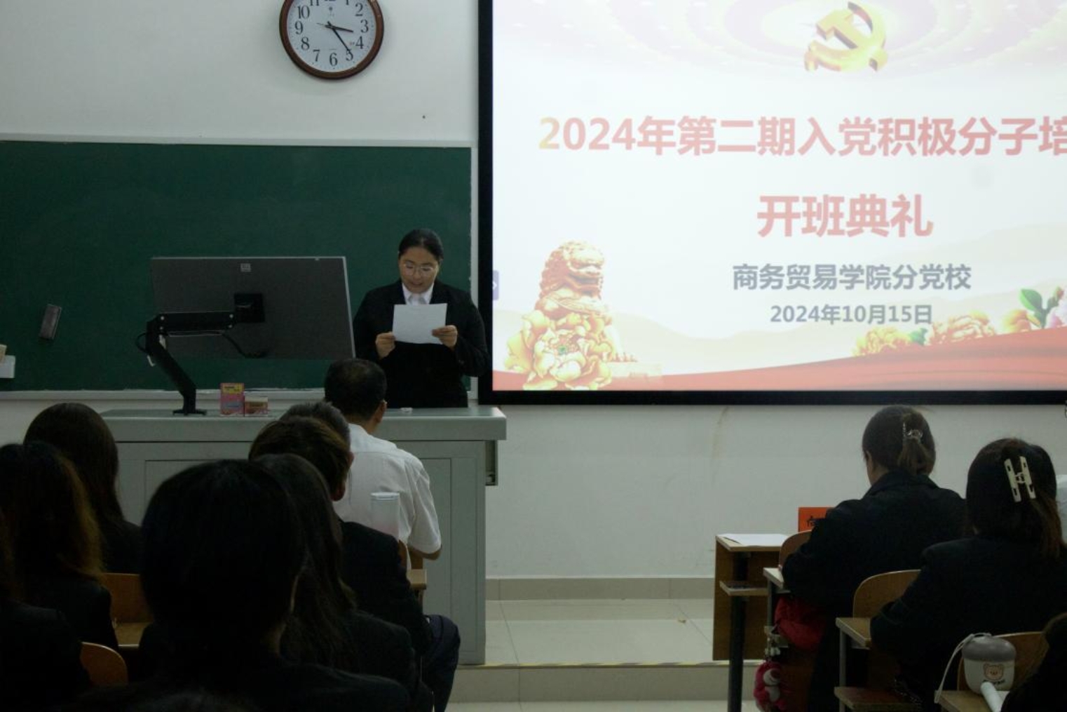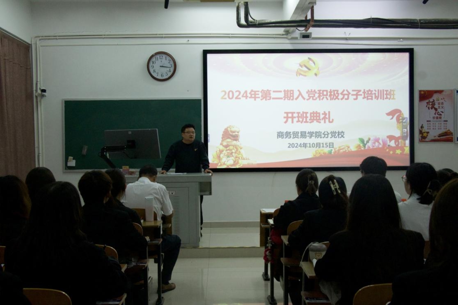 2024年10月15日下午,商务贸易学院分党校2024年第二期入党积极分子培训班开班典礼在励志楼317顺利举行,全体入党积极分子参加,学院党总支书记严可为,副书记向林峰、温拥军及党总支全体成员出席。本次开班典礼由党总支专职组织员、学工支部书记王馨颖主持。
