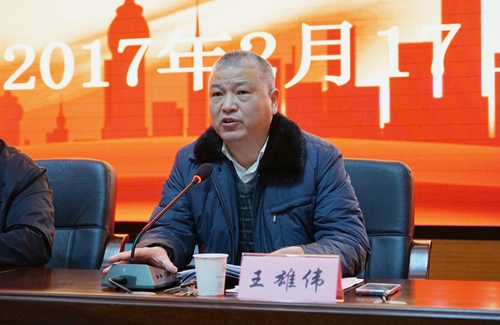 校长王雄伟代表学校党委、行政向全体教职工送上新年祝福,并对寒假期间坚守在工作岗位的教职工致以诚挚感谢?;嵘?,他就2017年学校主要工作进行了全面部署:一是要扎实做好两大基础工程和三个重点项目建设。立德树人和综合治理是学校发展两大基础工程,落实立德树人根本任务必须加强和改进学校思想政治工作,深入学习贯彻全国高校思想政治工作会议和中央31号文件精神,切实加强党的政治领导和思想领导,着力提升教师队伍思想政治素质。综合治理工作要把握“稳中求进”的总基调。推进和谐平安校园建设,加强校园环境优化,扎实推进治理能力建设,加快建立现代化教育治理新格局。他指出,“建卓越、争一流”、招生工作改革、新校区建设是2017年学校三大重点建设项目。务必早谋划、早安排、早部署。王雄伟告诫化院人在工作中要做到相互理解、相互支持、相互包容、相互帮助、相互欣赏,为建设美丽、幸福的化院做出新贡献;二是学习、担当、团结,不忘初心,继续前行。他强调,时代赋予化院人使命,我们唯有强化学习意识,敢于担当,肯干、苦干加实干,万众一心,才能成就化院新辉煌。