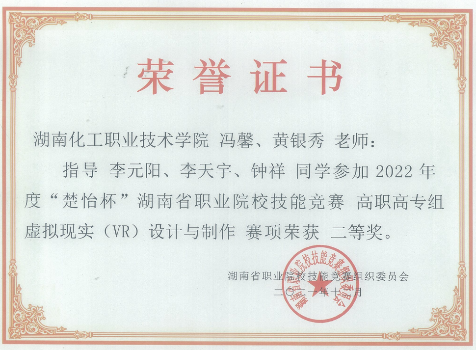 虚拟现实(VR)设计与制作赛项 省级二等奖 |