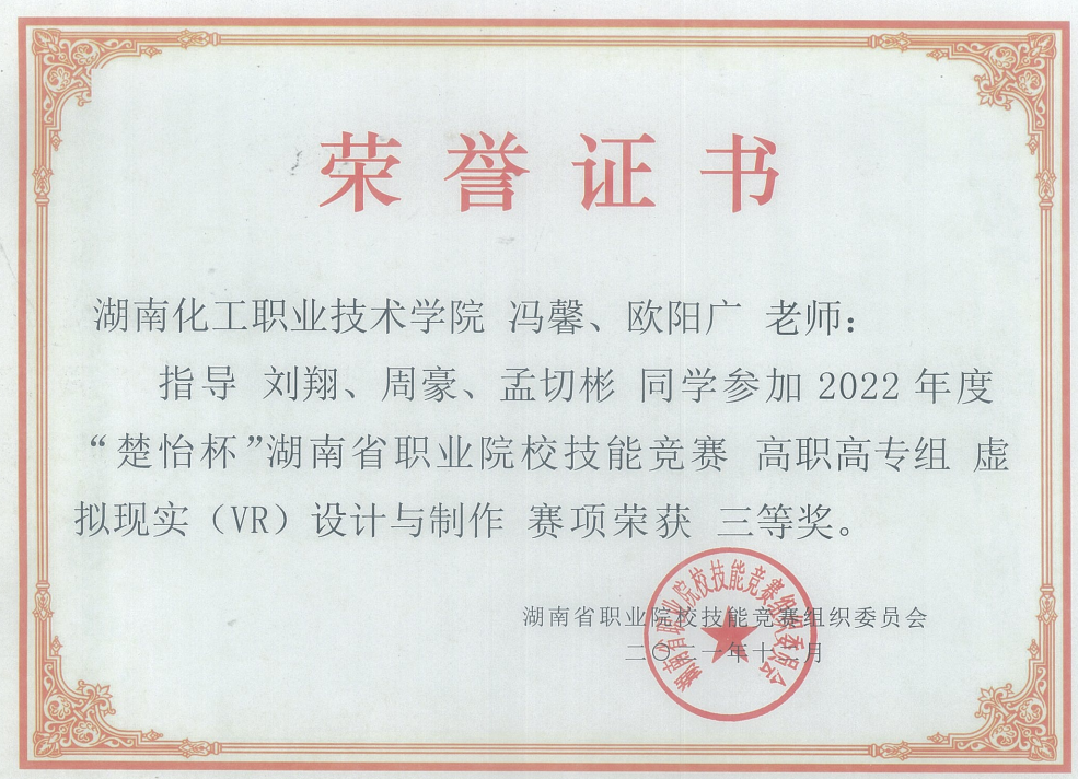 虚拟现实(VR)设计与制作赛项 省级三等奖 |