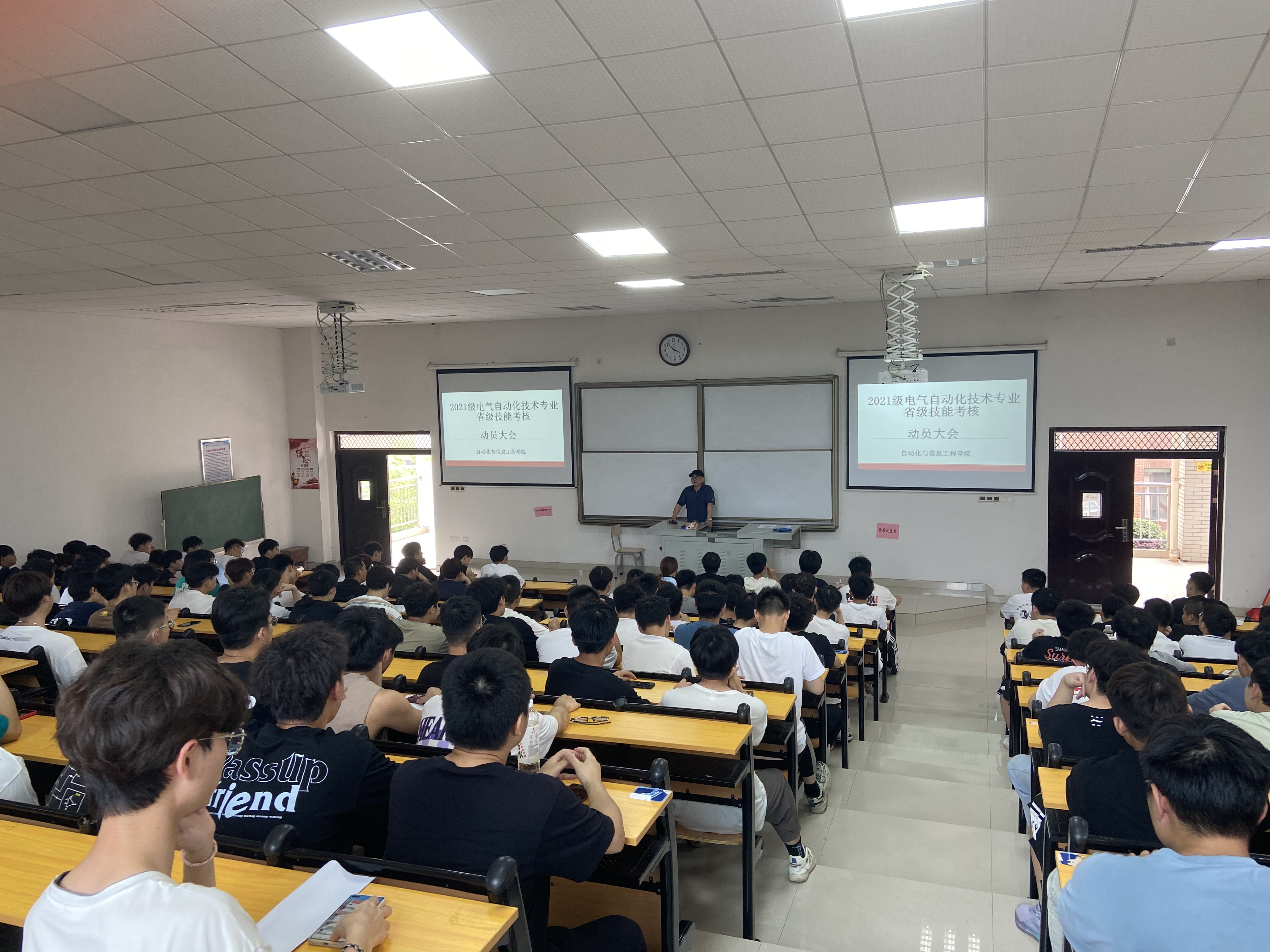 为积极迎接2022年度湖南省高职高专院校学生专业技能抽查考试,5月16日,学院组织2021级电气自动化技术专业全体学生在励志楼222召开了专业技能抽查动员大会。学院院长欧阳广、党总支副书记郭浪和学校教务处长罗源、副处长聂辉文等参加了会议。