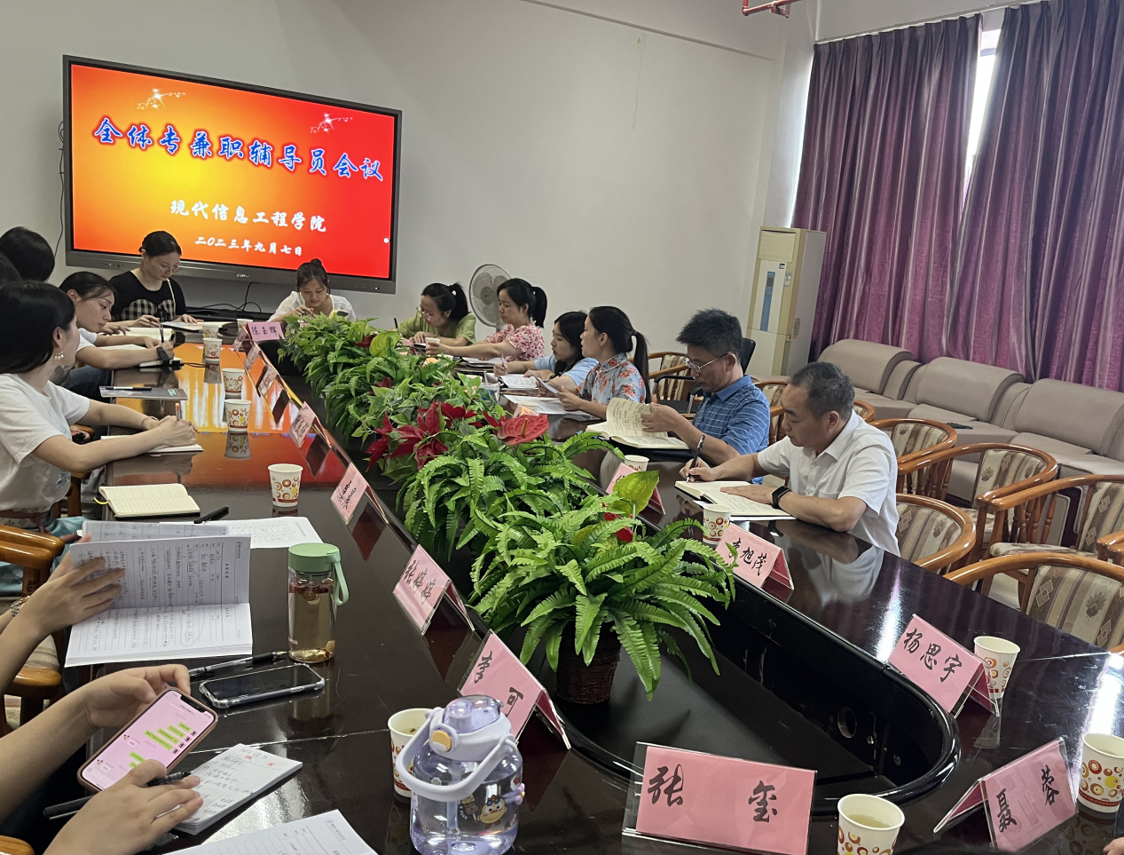 为贯彻落实学校2023年秋季开学相关工作会议精神,扎实推进“五个一”工作,把学校对学生的关心爱护落到实处,9月7日下午,在笃学楼219会议室,现代信息工程学院组织召开新学期全体专兼职辅导员会议。学院党总支书记姜红辉、副院长侯小毛、党总支副书记刘三婷出席会议。