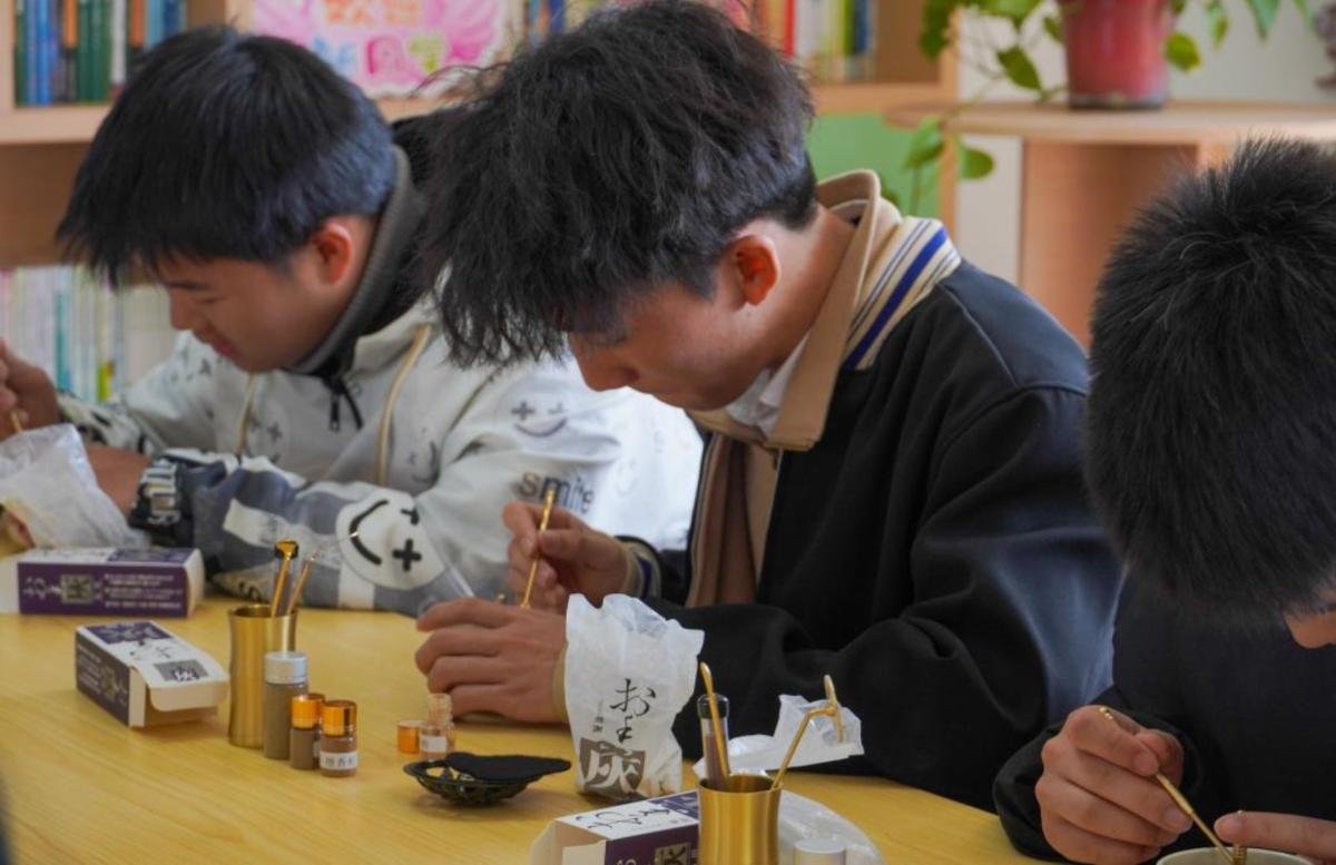 活动伊始,工坊指导教师刘三婷以“春分与香事”为题展开讲解。她介绍,香篆是宋代文人“四般闲事”之一,将特制香粉填入篆模形成连贯图案,燃香时既可计时,亦能修身养性。春分阴阳相半,恰是疏肝理气、调和身心的好时节,古人常借制篆品香以应天时。刘老师一边演示香灰压平、篆模定位、填粉起篆的步骤,一边解读节气养生与传统香文化的内在关联。
